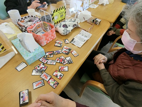 写真は完成品でカルタを行っている写真です。どうしても感染対策のアクリルボードで狭い空間とはなってしまいますので、とりあえず職員で遊んで見ました。なかなか取りづらい札もありますが、楽しんでいただける卓上レクがまた一つ増えました。