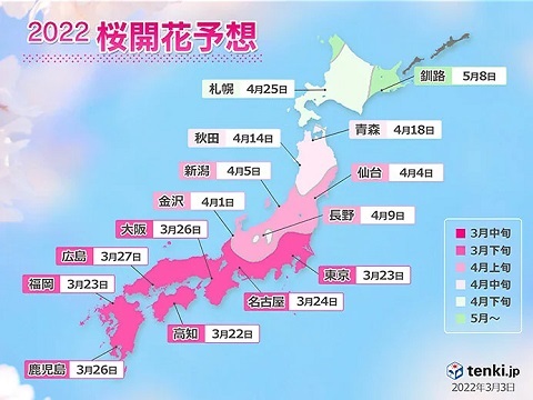 ちなみに、愛媛県の桜開花予想日は「3月25日」(平年3月24日)、満開予想日は「4月3日(平年4月3日)だそうです。お花見に行かれる方は是非スケジュールを組む際の参考にしてくださいね。