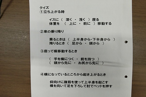 次にクイズ形式で、起き上がり動作の確認をさせて頂きました。