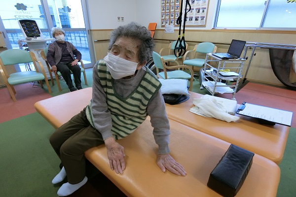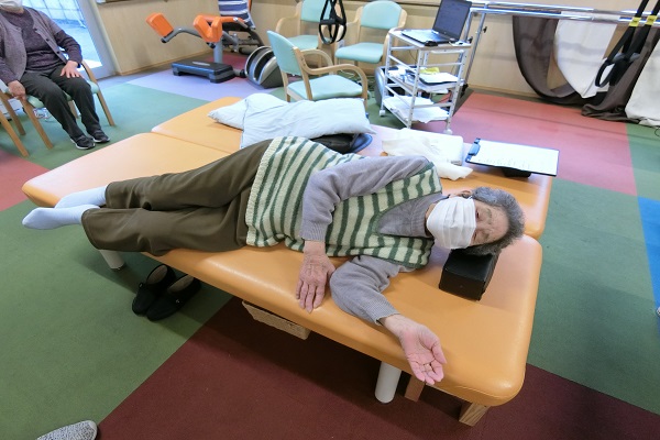 今回モデルになられたご利用者様は、変形性膝関節症や加齢による筋力低下および体力低下が見られる方です。今回のレクチャーを受けられるまでは、体幹を屈曲する腰に負担の大きい起き上がり方をされていました。