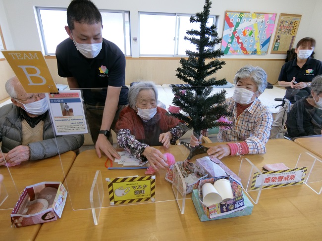 まずは、グループに分かれご利用者様にお花紙でできた花を飾り付けていくタイムトライアルです。