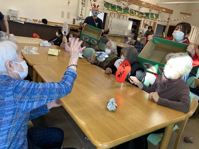 このゲームは1人ずつ新聞紙を5枚丸めていただき、サンタやトナカイにコスプレした職員が持っている箱めがけて投げ、いくつ入るかというゲームです。単に投げ入れていただくだけではなく、反対の列にはその投げられた新聞紙を守るチームもあり、とても熱戦が繰り広げられました。利用者様からは、「なかなか入らなくて難しかった~」「いっぱい入れれたよ!」と言った声が様々なところから聞こえてきました。