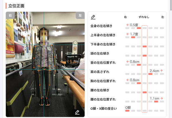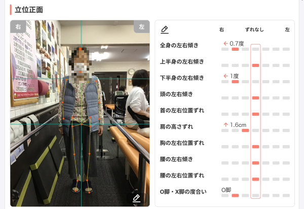 ケアプラスでは年4回立った状態でいろんな姿勢を撮り、細かく数値を出し、今のご自身が真っすぐ立てているのか、それとも曲がっているのかを評価しています。