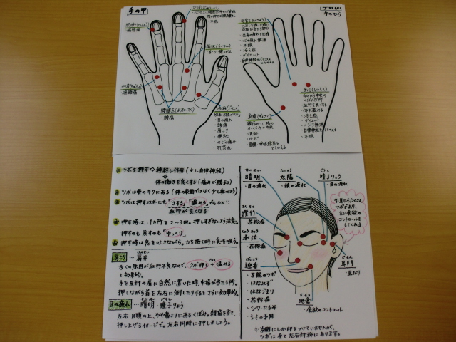 仕上げに水分補給もしっかりとして頂き、今回も午後からリラックスした一日となりました。また、空いた時間を使ってご自身でもできる手と顔のツボ押しの資料も配布させて頂きました。これでご自宅でもリラックスした時間が過ごせることと思います。