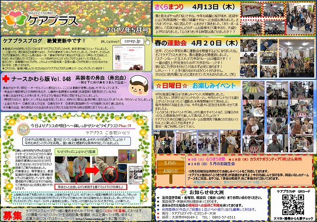 ケアプラス大洲 新聞更新しました。大洲市内各地の桜も終わりを迎え、春から夏へ変わり始めてまいりました。日中は汗ばむ陽気の日も多く、ケアプラス大洲のスタッフも日中は半袖で仕事をしております。4/29(土)西予市宇和町では恒例の「れんげまつり」も開催されましたね。私の地元でもあり、前夜祭の花火大会では1万発の花火が夜空を彩りました。1万発の花火にも負けない、素敵なケアプラス大洲新聞5月号のご紹介です。今月は、4月の2大イベント「さくらまつり」「春の運動会」の様子を大きく掲載しております。4/13(木)さくらまつり春と言えば、「桜」を思い浮かべる方も多いのではないでしょうか。そんな「桜」にちなんだゲーム大会で、皆様と一緒に盛り上げりました。カラーボール蹴り・花咲か爺さんといったオリジナルゲームで「心うきうき」過ごされました。4/20(木)春の運動会最近では春に運動会をする学校も増えております。そこに便乗して、ケアプラス大洲でも「春の運動会」を開催致しました。スプーンリレー・玉入れ・万歩計リレーの3種目。日頃のリハビリの成果を発揮し、腕や足を大きく動かして頂きました。翌日には、「筋肉痛です…。」と言われる方もおれるほど、皆様真剣にお身体を動かして頂けたようです。「体しっかり」イベント大成功ですね。ほか、日曜日は週替わりでお楽しみイベントを開催させて頂いております。4月は、「ハンドマッサージ」「プチさくらまつり」「ミニ運動会」「4月のお誕生日会」を行いました。平日にお休みされた方、イベントにどうしても来られなかった方など、振替・追加でもご利用を頂きました。5月も引き続き週替わりイベントを開催致します。是非ともご利用ください。最後に5月のイベント告知です。●5/9(火)心うきうきまつり恒例の「うきうき祭り」ですよ!!人気イベントですので、是非ともご参加下さい。●5/18(木)カラオケボランティア「絆」さんご来所素敵な歌声を皆様に届けて下さります。●5/28(日)5月のお誕生日会毎月の恒例行事です。5月生まれの皆さん、主役の季節がやってまいりました♪日々、皆様と笑顔で過ごさせて頂いております。デイサービスのご利用を検討されている皆様、一度ケアプラスデイサービスセンター大洲をご見学下さい。見学来所、体験利用は随時承っております。お電話・直接来所でお問い合わせください。