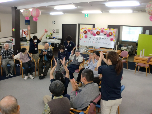ケアプラス大洲では相変わらず毎月イベント盛り沢山で楽しい時間を過ごして頂いております。4月は「さらまつり」「春の運動会」「ハンドマッサージ」「4月のお誕生会」を開催させて頂きました。